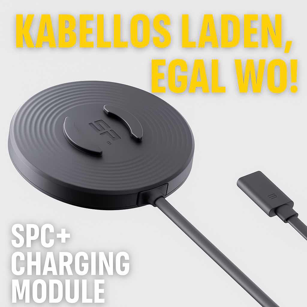 Technisch basiert das Charging Module auf dem bekannten Qi-Standard, liefert bis zu 15 W Ladeleistung und ist damit für alle aktuellen iPhones (ab iPhone 8 aufwärts) sowie viele Androids geeignet – vorausgesetzt, man verwendet das passende SPC+ Case. Das Modul erkennt automatisch, ob ein kompatibles Gerät vorliegt, und startet den Ladevorgang nur dann, wenn alles passt. Das spart Energie, reduziert die Hitzeentwicklung und verlängert die Lebensdauer des Akkus.